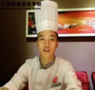 我之前從學(xué)校畢業(yè)出來(lái),那時(shí)候也不知道去哪里,因?yàn)椴焕^續(xù)讀書了,就出去做了服務(wù)員,通過(guò)做服務(wù)員我就了解了一些廚房的東西,對(duì)廚房的東西產(chǎn)生了興趣,然后就在網(wǎng)上(看到華南烹飪學(xué)校招生)報(bào)了名,然后進(jìn)到華南烹飪學(xué)校學(xué)習(xí)。