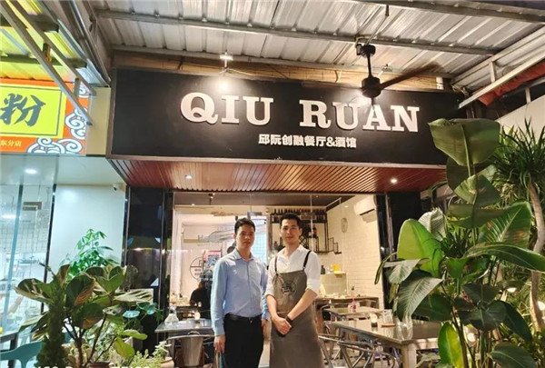 ▲我校畢業(yè)學子邱圣權(右)創(chuàng)業(yè)成立邱阮創(chuàng)融西餐廳,年收入32萬