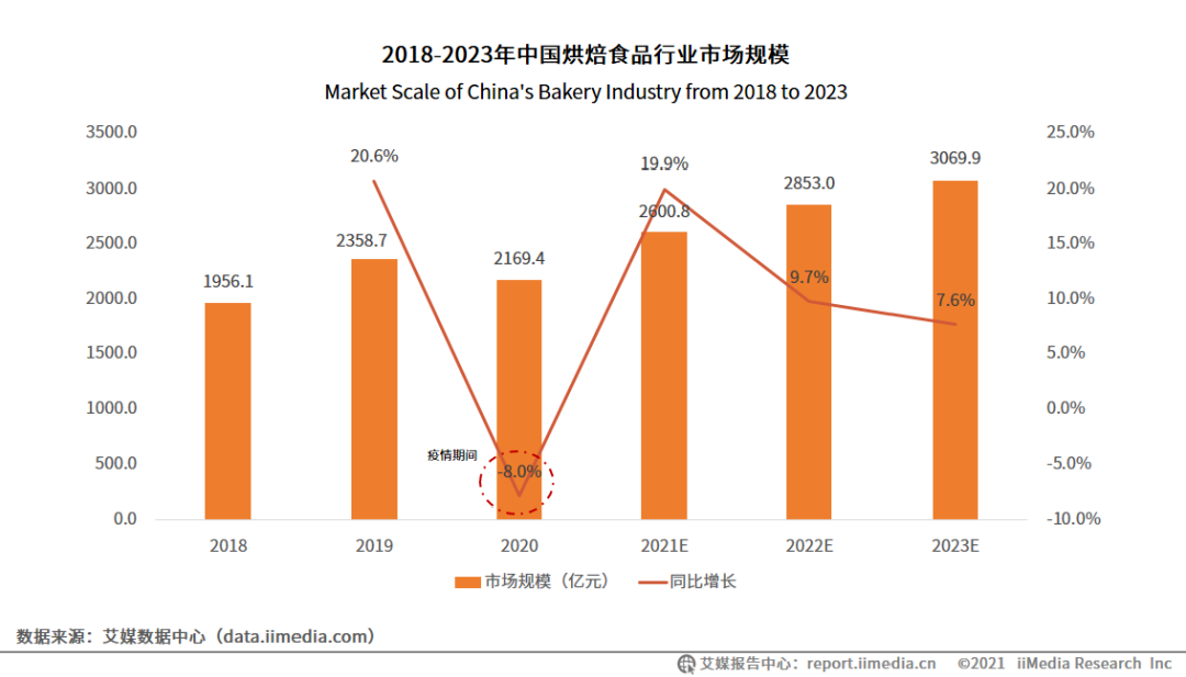 權(quán)威數(shù)據(jù)中心數(shù)據(jù)顯示,過去的2021年中國烘焙食品市場規(guī)?傊禐2600.8億元,同比增長率高達19.9%。2022年,預估我國烘焙食品市場將繼續(xù)保持10%左右的增長率,明年中國烘焙食品市場規(guī)模預計將高達3069.9億元。
