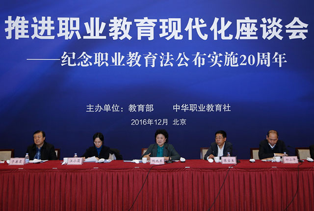 劉延東指出,《職業(yè)教育法》頒布20年來,職業(yè)教育快速發(fā)展,辦學活力持續(xù)增強,建成全球規(guī)模最大職業(yè)教育體系,培養(yǎng)了大批高素質勞動者和技能人才,為經濟社會發(fā)展作出了重要貢獻。她強調,要圍繞國家發(fā)展和民生需求,堅持服務大局、育人為本、就業(yè)導向、多元辦學、依法治教,把職業(yè)教育放在供給側結構性改革和促進就業(yè)大格局中謀劃,深化教育鏈產業(yè)鏈融合,主動服務動能轉換和產業(yè)升級。要健全體制機制,建設示范性職業(yè)教育集團,推動具備條件的普通本科高校向應用型轉變,實施好現(xiàn)代職業(yè)教育質量提升計劃、產教融合發(fā)展工程,吸引社會力量投入。要緊跟產業(yè)變革創(chuàng)新培養(yǎng)模式,強化思想品德、職業(yè)道德教育,強化工匠精神培育,加強“雙師型”教師隊伍建設。要發(fā)揮職業(yè)教育在脫貧攻堅中的作用,建好貧困地區(qū)發(fā)展急需的中等職業(yè)學校,確保貧困地區(qū)有需求的青少年至少掌握一門實用技能,為他們人生出彩提供更多機會。要落實職業(yè)學校生均撥款制度,提高技術技能人才待遇地位,為職業(yè)教育營造更好環(huán)境。