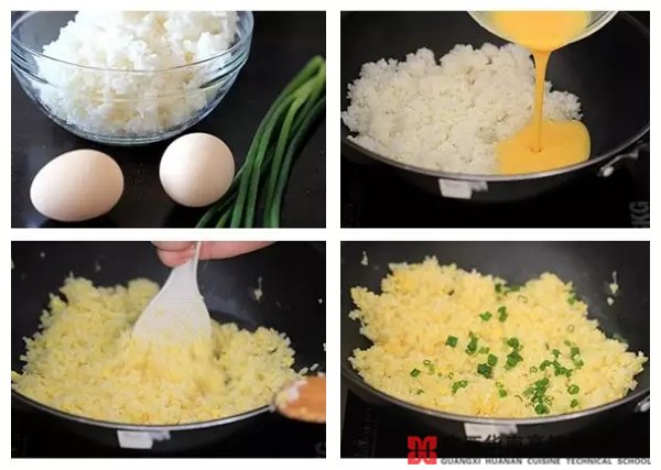 1.加入雞蛋液之前,首先要翻炒米飯,使其除去額外的水分。