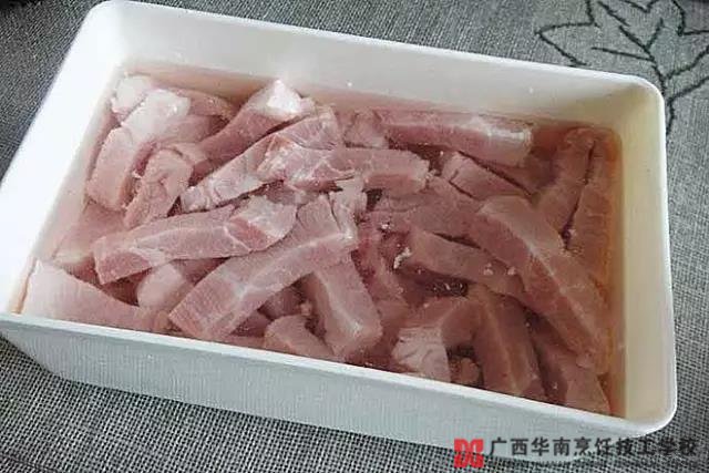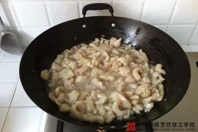 二、將切好的豬肉片放在漏勺里,在沸水中晃幾下,待肉剛變色時(shí)就起水,瀝干水分,然后下鍋炒,幾分鐘即熟,鮮嫩可口。