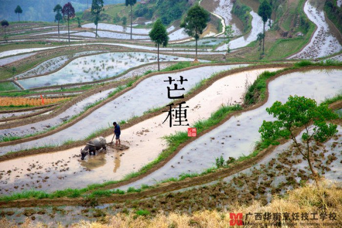 【芒種】這一時節(jié),已經(jīng)進入了典型的夏季,天氣非常炎熱。“芒”是指麥類等有芒作物成熟,開始收割;“種”指谷黍作物的播種。《月令七十二候集解》 :“五月節(jié),謂有芒之種谷可稼種矣。”