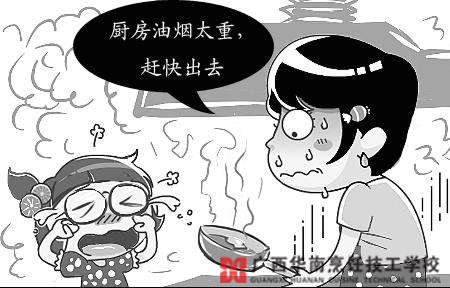 廚房的油煙與炒菜時(shí)的油溫有直接關(guān)系,當(dāng)油加熱超過200℃時(shí),所生成的油煙具有強(qiáng)烈的辛辣味,對(duì)鼻、眼、咽喉黏膜有較強(qiáng)的刺激,可能引起鼻炎、咽喉炎、氣管炎等呼吸道疾病。當(dāng)油溫超過300℃,產(chǎn)生的有害物質(zhì)會(huì)導(dǎo)致慢性中 毒,容易誘發(fā)呼吸和消化系統(tǒng)癌癥。炒菜時(shí),不要使油溫過熱,油溫不要超過200℃(以油鍋冒煙為極限),這樣不僅能減少油煙的產(chǎn)生,菜中的維生素也能保留更多。