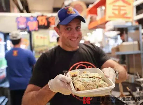 店主名叫布萊恩·戈德堡,中文名金伯亮,人稱(chēng)老金。為了適應(yīng)美國(guó)人的喜好,老金改良了煎餅的配料和口味。用甜、咸、辣的海鮮醬代替腐乳,用炸餛飩皮代替油條,還添加了老干媽豆豉辣醬。