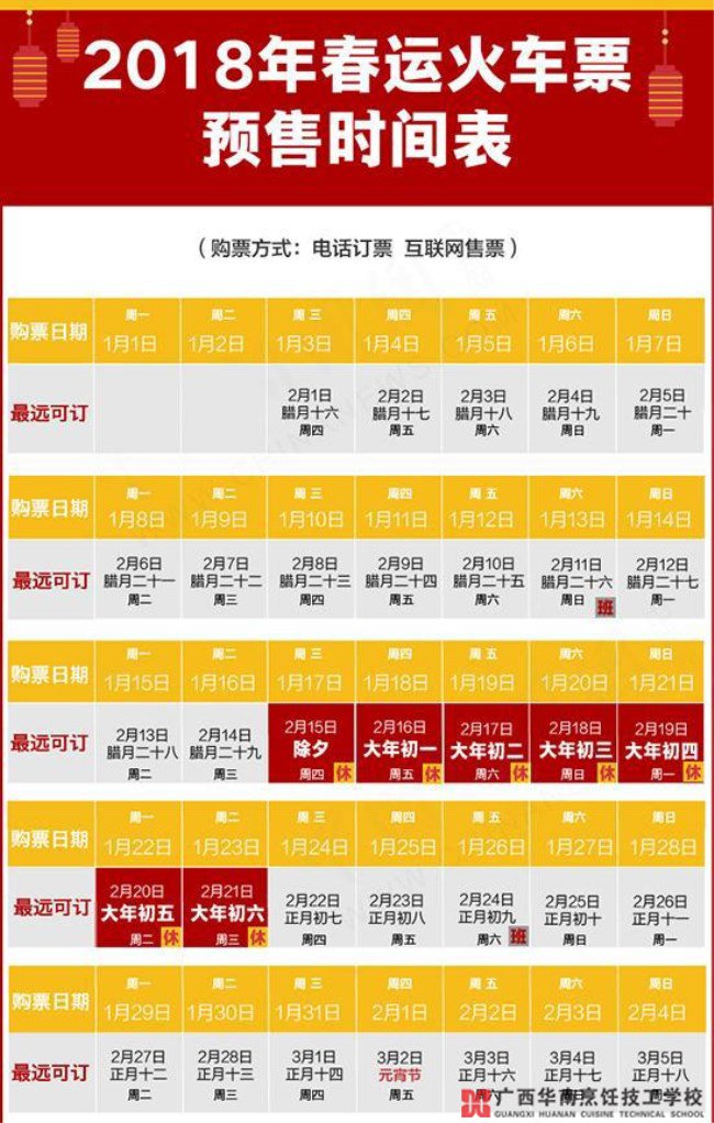 一年一度的“春運”就要到來,春運火車票一票難求,所以小伙伴們要提前做好準備,小編給您準備了一張訂票的時間表,只要按表上的買票日期提前訂票,比“春運”大戰(zhàn)搶票要容易得多,所謂一圖在手,買票不愁啊!2018春運火車票已經(jīng)發(fā)售!你做好搶票的準備了嗎?