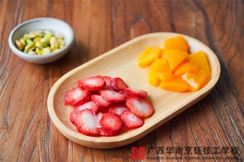 2、開心果去殼,糖水黃桃切成小塊,冷凍好的草莓取出切片。