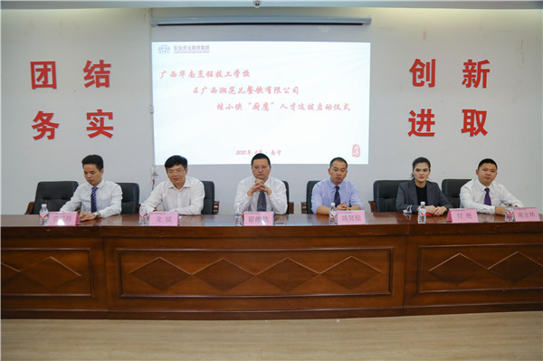 4月8日,廣西華南烹飪技工學(xué)校東盟校區(qū)舉行蛙小俠“雛鷹”人才選拔啟動儀式。校長翟維鐵、校區(qū)主任姚賢穩(wěn)、就業(yè)辦主任唐毓得及校區(qū)負責(zé)人,廣西湘范兒餐飲有限公司公共事業(yè)部總監(jiān)龍斌及企業(yè)相關(guān)負責(zé)人等出席啟動儀式。