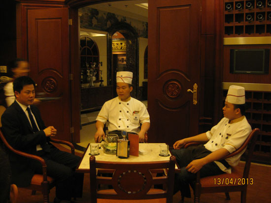 在南寧好友緣國(guó)宴飯店,受到了飯店人力資源部工作人員熱情接待。參觀考察過(guò)程中,老師們?cè)敿?xì)了解企業(yè)的文化,企業(yè)員工的工作、生活等情況。在廚房,老師們見(jiàn)到了設(shè)施齊備,管理規(guī)范,衛(wèi)生干凈的現(xiàn)代化的廚房管理。參觀廚房過(guò)程中,老師們還不時(shí)和廚房師傅切磋交流。參觀結(jié)束后,人力資源部工作人員和廚房師傅們也向老師們提出一些建議,希望學(xué)生們?cè)谄綍r(shí)的學(xué)習(xí)中扎實(shí)基礎(chǔ),并且多研究新式菜肴。