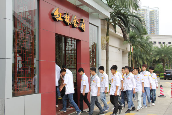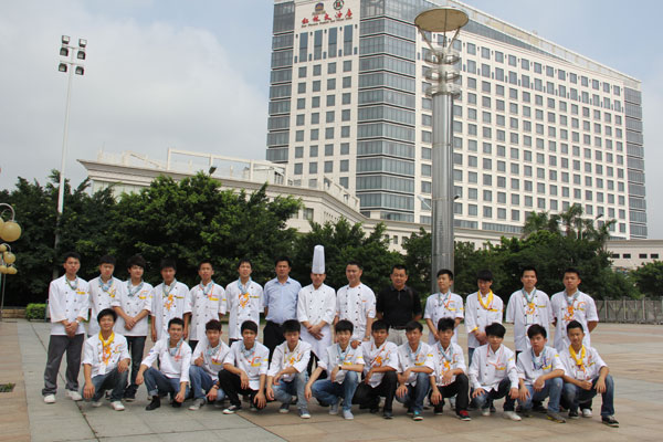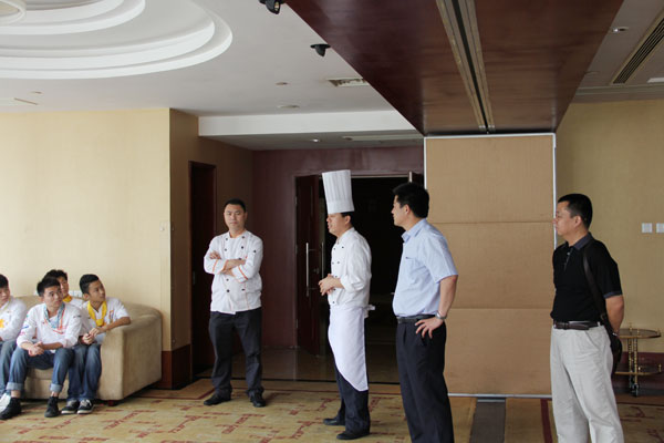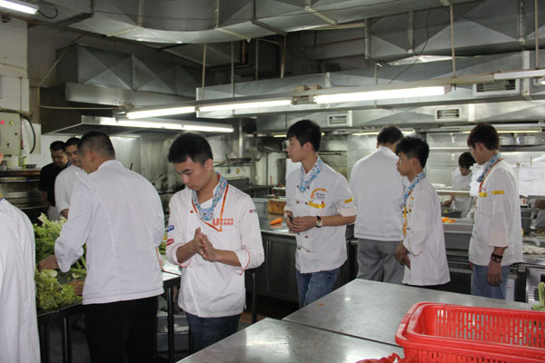 南寧紅林大酒店是南寧市最高端、規(guī)模最大、配套最完善的五星級酒店之一,該酒店從廣西華南烹飪學(xué)校建校之初就與之建立起校企合作關(guān)系,并在校設(shè)立定點委培基地,簽訂訂單式就業(yè)協(xié)議,為學(xué)生提供優(yōu)越的薪資待遇及廣泛的發(fā)展空間。雖然酒店環(huán)境優(yōu)越,但學(xué)生們還是希望親自見識一下。沃頓酒店的行政主廚帶領(lǐng)學(xué)生們對富麗堂皇的酒店和配備完善的后廚進(jìn)行了一次仔細(xì)的觀摩。廣西華南烹飪學(xué)校設(shè)有酒店式模擬廚房,學(xué)生在平時學(xué)習(xí)中就可以模擬酒店后廚中的各個崗位,因此當(dāng)學(xué)生們走入沃頓酒店后廚時,對這里的設(shè)施設(shè)備并不陌生,但酒店廚房的規(guī)模還是讓學(xué)生們?yōu)橹惑@。一想到這里很可能會是他們以后的工作場所,學(xué)生們非常興奮,紛紛拍照留戀。