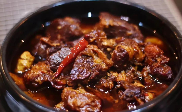 等到所有香料都炒出香味時,就可以放入牛肉塊了,火候繼續(xù)保持著中火,慢慢將香料和牛肉塊一起炒,讓牛肉慢慢入味。