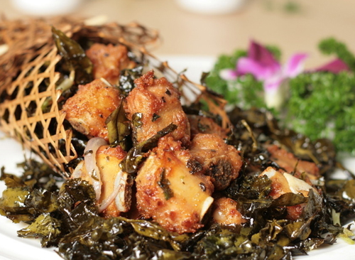 5.另起鍋倒入油燒熱,放一半泡過水的茶葉大火炸酥,取出,撒在排骨上。