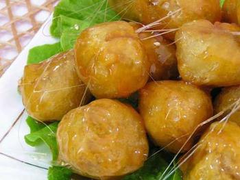 1、鍋內(nèi)加植物油燒至五成熱時,倒入元宵,炸至金黃色時撈出。