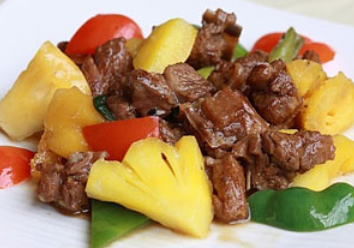7. 炒鍋留底油燒熱,下辣椒、蒜蓉、蔥段、酸子姜和鴨片,滴入料酒、芡汁,下菠蘿片炒勻上碟。