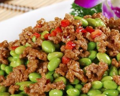 2、毛豆洗干凈后,瀝干水分。油燒至5成油溫,倒入毛豆。