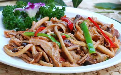 4、炒鍋油熱后先放蒜瓣炒香,然后放豬肚絲大火快炒至七八成熟時(shí)倒入少許米酒,放茶樹(shù)菇和適量生抽繼續(xù)翻炒,炒的過(guò)程中放鹽和白糖調(diào)味,快要出鍋前放青紅椒略炒后出鍋,裝盤(pán)后淋入香油即可。