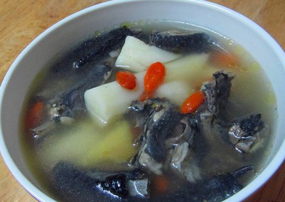 烏骨雞1只、山藥150克、枸杞10克、蔥姜、鹽、料酒適量。