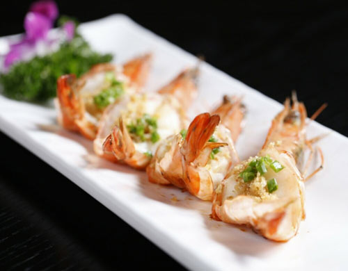 4、將開邊蝦依次像人字形整齊地排列在魚盤中;