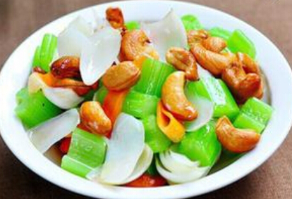 百合50克,西芹200克,胡蘿卜100克,腰果50克,鹽、白砂糖各適量。
