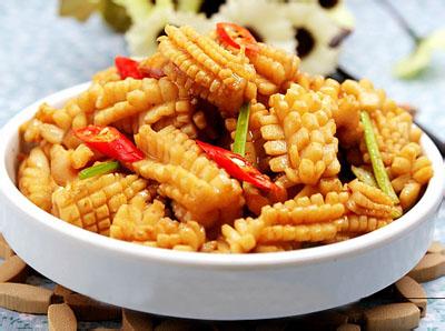 1、魷魚洗切好,將背面(內(nèi)里那一面)斜切花刀,改小片。