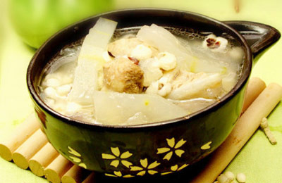 6.把排骨、薏米、芡實(shí)和姜片一起倒入湯鍋內(nèi),然后注入適量的水大火燒開(kāi),待排骨的水開(kāi)后,再倒入冬瓜,再轉(zhuǎn)中火慢煲1小時(shí)左右,加鹽調(diào)味即可食用。