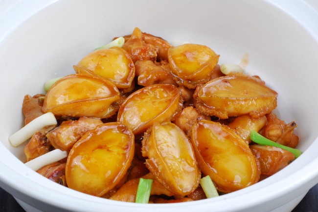 5、雞塊炒到全部收縮時,下料酒,燜鮑魚的湯汁,再加些許水,用鮑魚汁調(diào)好味,蓋上鍋蓋將雞塊燜至八成熟。