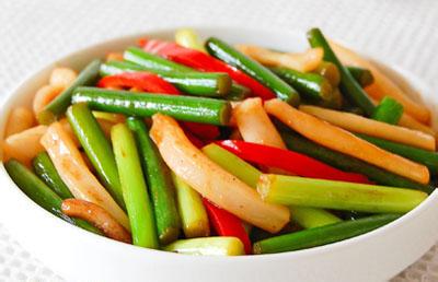 1、將蒜苔的頭摘去,整根洗凈后,用刀先將根部切下一點,再改刀切成3厘米長的段。魷魚去內(nèi)臟、撕去表皮的薄膜橫切條,入沸水汆燙10秒撈出備用。