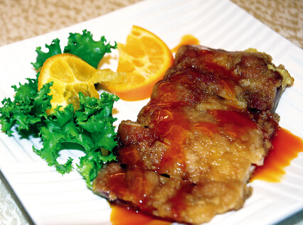 6、取出切塊,排放在盤中淋上橙汁醬即可。
