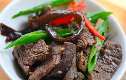 材料:牛肉400克、木耳180克、青椒、紅椒1根、紅尖椒1個(gè)、生姜適量、大蒜適量;