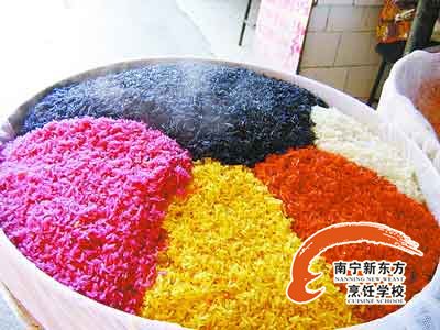 4、提取四種液汁出來后,分別把不等量的米放入其中浸泡,等其上色后放入蒸籠中蒸約一個(gè)鐘頭,便可蒸出黑、紅、黃、紫、白(糯米本色)五種顏色的糯米飯。這樣做出來的五色糯米飯色澤鮮艷、五彩繽紛、晶瑩透亮,再加上它的滋潤(rùn)柔軟、味道鮮美、醇正平和、且有微甘,真是吃起來令人回味無窮。用天然植物染成的五色糯米飯,不僅美觀美味,而且有一定的藥用價(jià)值。紅蘭草有生血作用,清代《侶山堂類辯》曰:“紅花色赤多汁,生血行血之品”,“黃花飯”或梔子有清熱涼血等作用,李時(shí)珍在《本草綱目》里說楓葉“止泄益睡,強(qiáng)筋益氣力,久服輕身長(zhǎng)年”,還說用楓葉煮成的青精飯,人食之能“堅(jiān)筋骨、益腸胃、能行、補(bǔ)髓”。