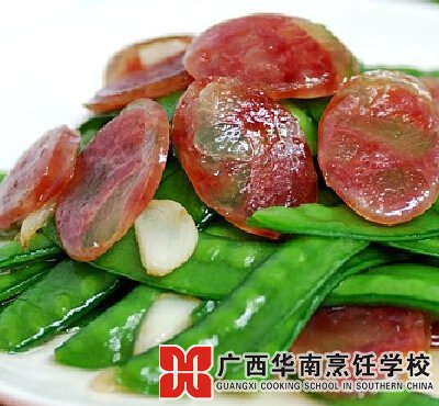 荷蘭豆200克、臘肉100克、香腸100克、胡蘿卜50克、鹽適量、雞精1小勺、大蔥1段、姜1塊、蒜3瓣、料酒1勺