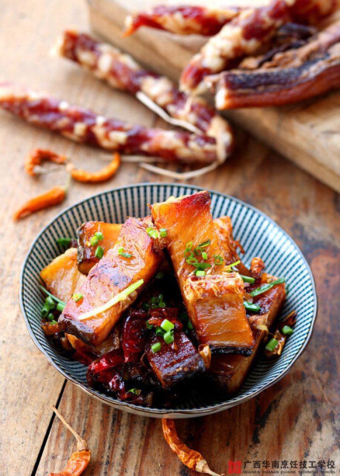 5、再放蒜末、姜絲、蔥段煸炒片刻,放臘魚塊翻炒;