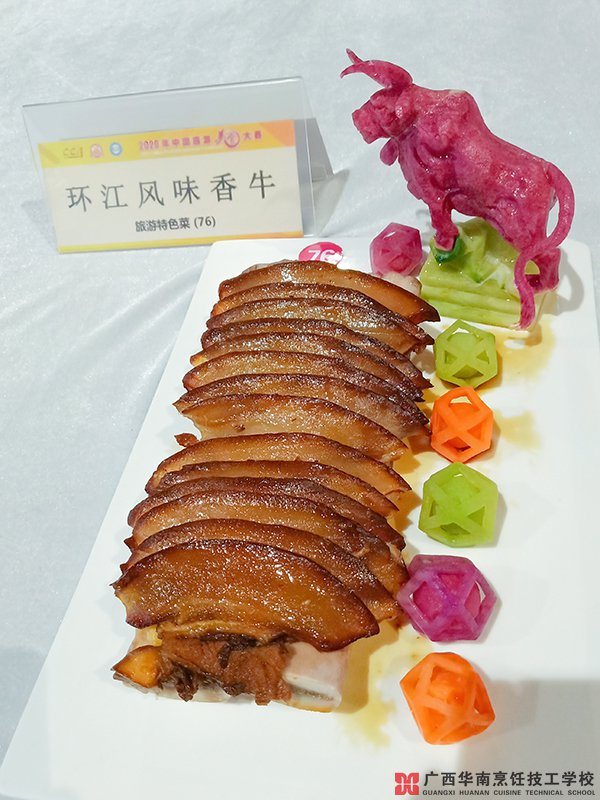我校大師黃盛制作【環(huán)江風(fēng)味香!恳徊,從菜品風(fēng)味、特色文化內(nèi)涵等方面獲得現(xiàn)場業(yè)內(nèi)人士一種認(rèn)可。據(jù)了解,環(huán)江香牛是廣西環(huán)江毛南族自治縣三寶(香豬、香牛、香鴨)之一,產(chǎn)于環(huán)江毛南族自治縣內(nèi)國家級(jí)喀斯特地貌原始森林自然保護(hù)區(qū)。獨(dú)特的地理環(huán)境和絕無僅有的水土特性,令環(huán)江香牛膘肥體壯,肉質(zhì)獨(dú)特,呈粉紅色,肥瘦相間,層次分明,鮮嫩紋細(xì),有“三隔肉相間”之稱。