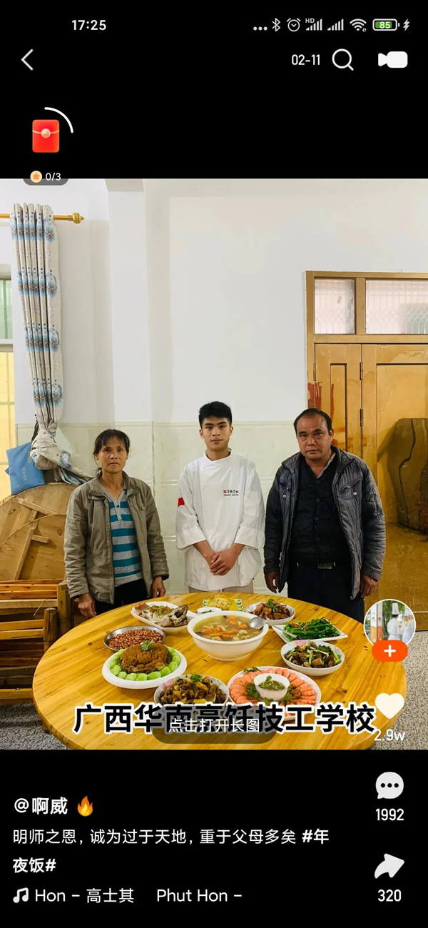 心中親情,手中鍋勺,過年期間華南烹飪學校開啟了“我為家人做年夜飯”感恩活動,許多學子踴躍參加,集贊最多者即可獲勝并贏得比賽獎金,接下來讓我看看學子們都為家人做了什么豐盛的菜肴吧!