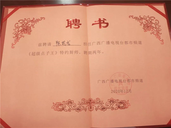 2020年特邀成為廣西廣播電視臺都市頻道《超級點(diǎn)子王》特約廚師