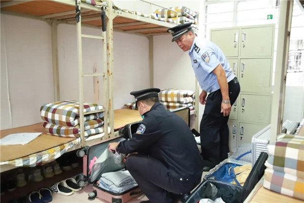宣講會(huì)結(jié)束后,新陽(yáng)派出所的警官們與華南師生一同前往學(xué)生各宿舍進(jìn)行全面搜查管制刀具等危險(xiǎn)違禁物品,并給每一位華南學(xué)子核查身份證,用實(shí)際行動(dòng)為我校學(xué)生言傳身教,保障我校學(xué)生的人身安全。