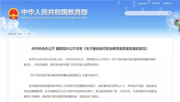 10月12日,中共中央辦公廳、國(guó)務(wù)院辦公廳印發(fā)了《關(guān)于推動(dòng)現(xiàn)代職業(yè)教育高質(zhì)量發(fā)展的意見(jiàn)》。其中指出,“加快建立“職教高考”制度,完善“文化素質(zhì)+職業(yè)技能”考試招生辦法。”“加強(qiáng)職業(yè)教育理論研究,及時(shí)總結(jié)中國(guó)特色職業(yè)教育辦學(xué)規(guī)律和制度模式。”