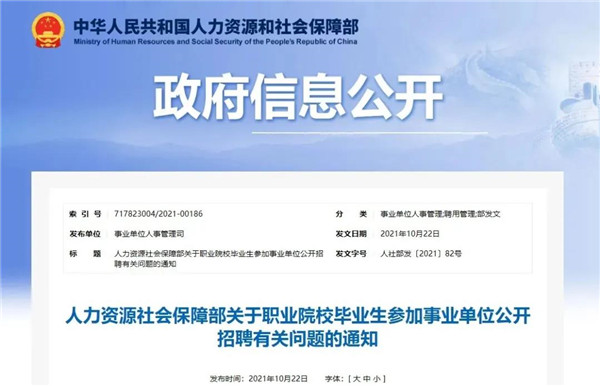 10月22日,人力資源社會(huì)保障部印發(fā)《關(guān)于職業(yè)院校畢業(yè)生參加事業(yè)單位公開(kāi)招聘有關(guān)問(wèn)題的通知》,也明確指出了,職校生同樣也擁有報(bào)考事業(yè)單位的資格!