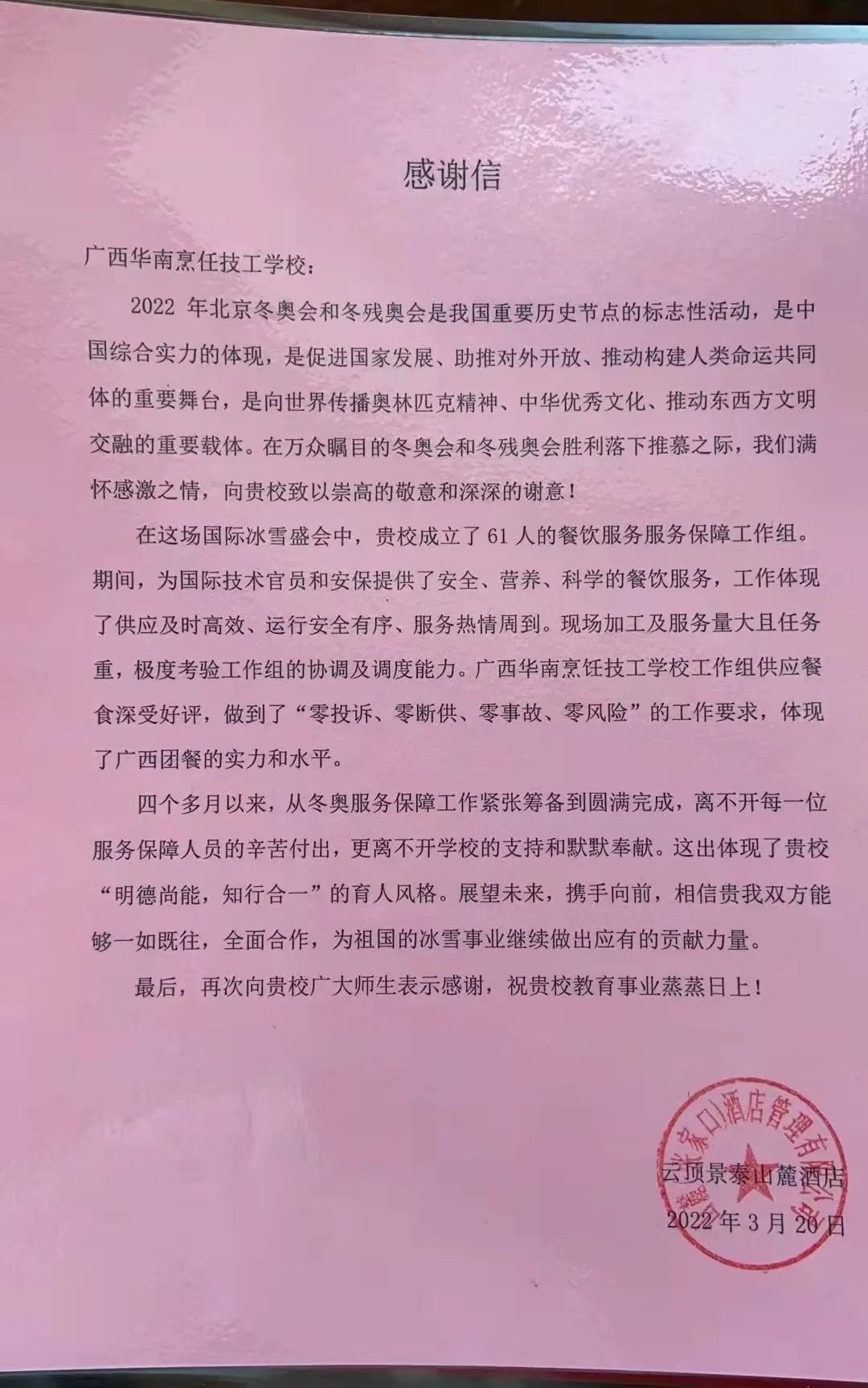 對(duì)于此行的感受,華南烹飪餐飲服務(wù)團(tuán)三年制粵菜大廚1907班黃日前說道:“所有的難忘匯成了永恒,成就了這屆冬奧會(huì)的無與倫比。很榮幸自己能親身參與到國家的盛事中,去服務(wù),去奉獻(xiàn),讓我無悔于青春,無悔于華南,在這場(chǎng)冰雪之旅之中我收獲了成長、友情、技能的提升,未來我將會(huì)更加努力學(xué)習(xí),在奮斗中創(chuàng)造屬于我自己的精彩人生!”
