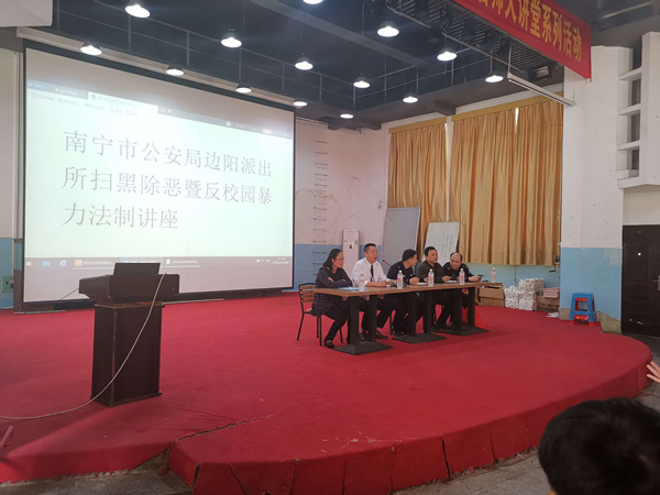 為深入推進校園掃黑除惡專項斗爭工作,增強學生法制觀念及安全意識,3月19日下午在廣西華南烹飪技工學校中堯校區(qū)大禮堂,我校特邀邊陽派出所民警為我校師生開展法制安全教育講座。