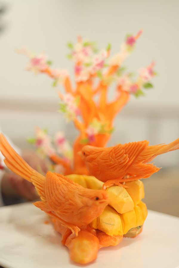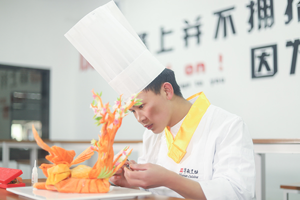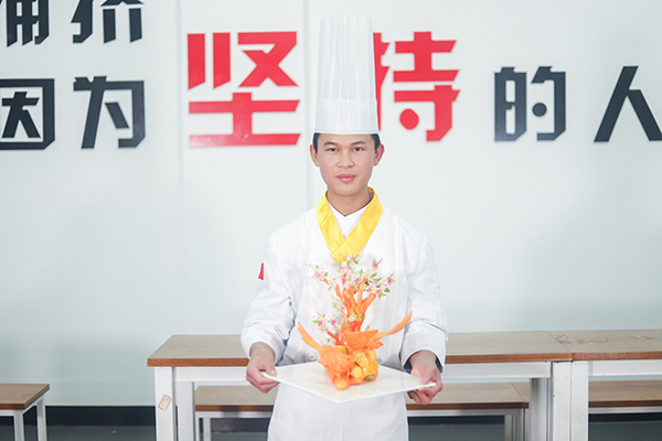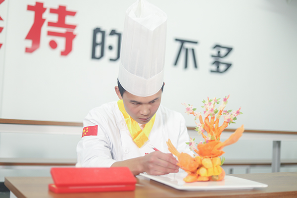 都說學(xué)烹飪有十八般武藝,刀工、勺功、雕刻、熱菜、冷拼一應(yīng)俱全。王洪表示,現(xiàn)階段課程正學(xué)到?jīng)霾穗A段,相對他而言,自己對雕刻、拼盤等內(nèi)容更加感興趣。烹飪它是一門技術(shù),需要?jiǎng)邮謱?shí)操學(xué)習(xí),在不斷地實(shí)操學(xué)習(xí)中強(qiáng)化自己的技能,于是王洪會利用課余時(shí)間練習(xí)雕刻手法,也會充當(dāng)老師的小助手,在班主任韋格啟的帶領(lǐng)與指導(dǎo)下學(xué)習(xí)到更多雕刻小技能,常常晚上12點(diǎn)才回宿舍休息。