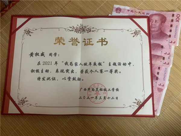 不得不提的是,在今年寒假的時(shí)候,學(xué)校舉辦了一次為家人做年飯主題實(shí)踐活動(dòng),鼓勵(lì)同學(xué)們用自己掌握的手藝給家人做菜。黃權(quán)威自然行動(dòng)起來(lái),他說(shuō),從買(mǎi)食材到做飯菜都全部是自己負(fù)責(zé)。“有些食材需要提前加工,從前一晚的下午5點(diǎn)忙到晚上11點(diǎn),又從第二天早上6點(diǎn)忙到中午12點(diǎn)才把一桌的菜做完。”
