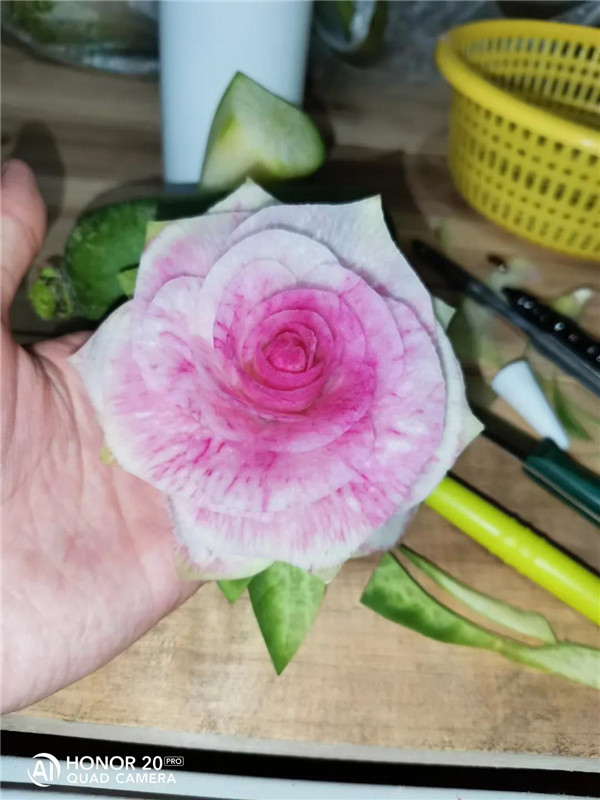 現(xiàn)在,唐江尚枝更熱愛的是果蔬雕刻和果醬畫藝術,朋友圈里都是日常里課上學習、課下練習的動態(tài),一個個從初學到逐漸精致的作品是自己每天努力與成長的最好證明。