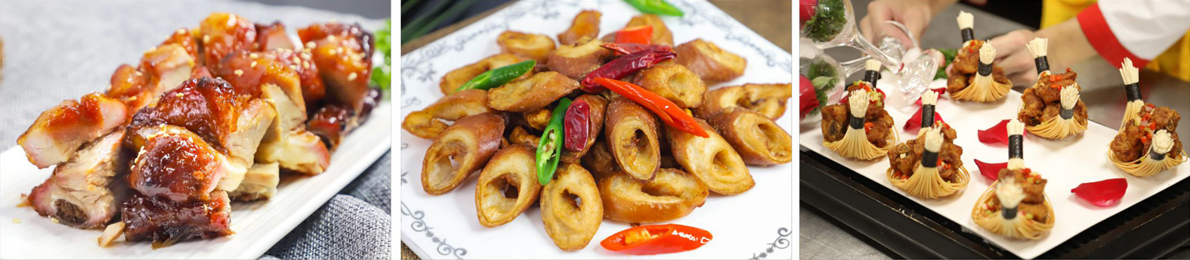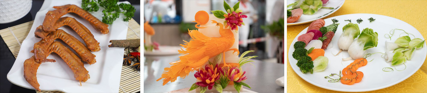 技能拓展 | 流行川湘粵菜:學(xué)習(xí)粵式白切雞、魚(yú)頭豆腐湯、白灼鴨胗、蟲(chóng)草花蒸全雞、菠蘿咕嚕肉等; 熱門(mén)川湘粵菜:黑椒牛仔骨、鮑魚(yú)扣飯、仔姜炒鴨、孔雀開(kāi)屏魚(yú)、木桶豬手等; 潮州鹵水:鹵水調(diào)制及市面爆款鹵味制作; 食品雕刻與拼盤(pán):海南風(fēng)光、迎客松、步步高升等食品拼盤(pán)等; 階段考核:考驗(yàn)學(xué)生對(duì)本階段學(xué)習(xí)菜品的掌握程度。 |